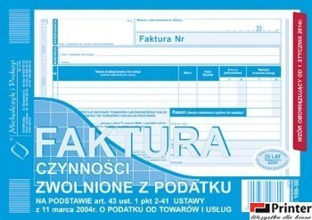 Faktura - czynności zwolnione z podatku na podstawie art..43ust.1 pkt 2-41 ustawy z 11.03.2004r.o podatku od towarów i usług, A5, (o+1k)