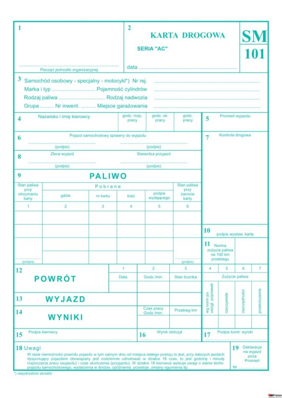 Karta drogowa SM/101 samochód osobowy (numerowana), A5, offset