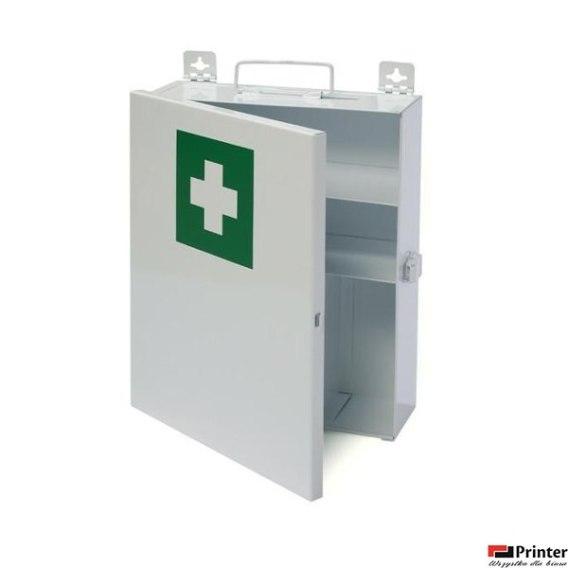 Apteczka HF072B Argo__ metalowa szafka zamykana na klamrę__ funkcjonalny rozkład półek__ wygodny uchwyt do przenoszenia apteczki__ kolor biały _ na drzwiczkach biały krzyż na zielonym tle__ wymiary: 290x230x80 mm_- jednostka sprzedazy 1 sztuka