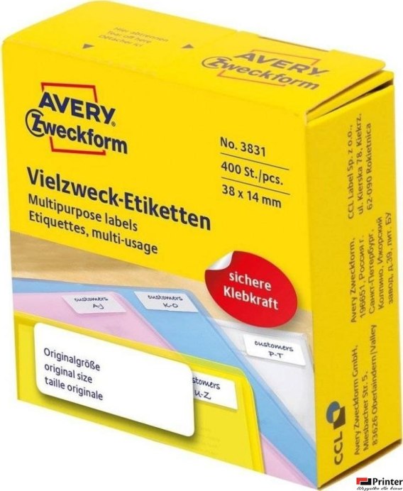 Białe minietykiety w dyspenserach do opisywania ręcznego, 400 etyk./op., 38 x 14 mm, białe, AVERY ZWECKFORM, 3831