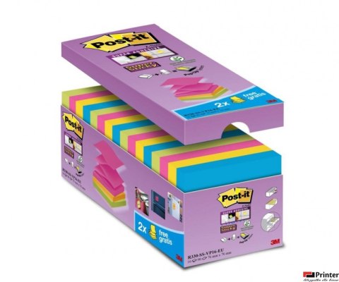Bloczek samoprzylepny POST-IT Super sticky Z-Notes (R330-SS-VP16), 76x76mm, 14x90 kart., mix kolorów, 2 bloczki gratis