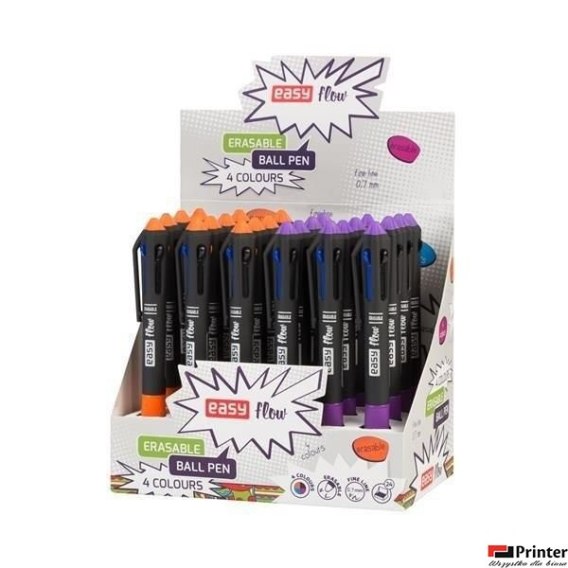 Długopis łączący 4 wkłady z wymazywalnym tuszem w 1 korpusie. Długopis wyposażony został w wygodny, automatyczny system wysuwania wkładu. Wystarczy jedno kliknięcie by wysunąć lub schować metalową końcówkę.__Miękki, gumowany uchwyt długopisu zapewnia wygodę nawet w trakcie wielogodzinnego notowania.___Parametry:_ - rodzaj tuszu: wymazywalny_ - grubość linii: 0,7 mm_ - kolor tuszu: czarny, niebieski, fioletowy, pomarańczowy_ - trwała, metalowa końcówka wkładu_ - możliwość wymiany wkładów (w ofercie dostępne dedykowane, kolorowe wkłady z wymazywalnym tuszem)_ - wygodny, gumowany uchwyt