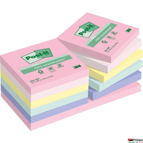 Ekologiczne karteczki samoprzylepne Post-it z certyfikatem PEFC Recycled, Pastelowe, 76x76mm, 16 bloczków po 100 kartek 654-1RPT