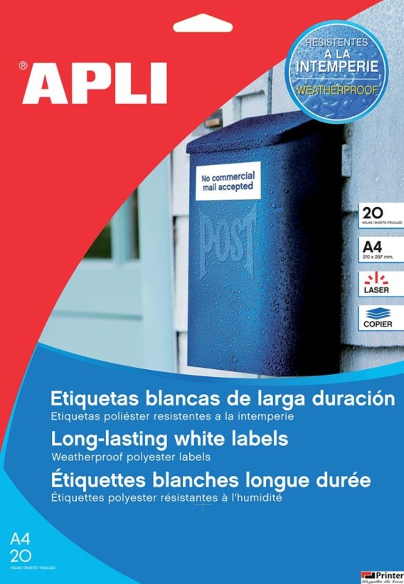 Etykiety samoprzylepne wykonane z matowego poliestru, odporne na działanie warunków atmosferycznych, odpowiednie do drukarek laserowych oraz kserokopiarek_do identyfikacji korespondencji, płyt CD/DVD oraz do identyfikacji zewnętrznej_specjalna formuła kleju nie ulega rozpuszczeniu przy wysokich temperaturach, dzięki czemu nie wycieka i nie odkłada się na mechanizmie drukarki_rozmiar etykiety: 210x297mm_liczba etykiet na arkuszu: 1_temperatura użytkowania: od -20_C do 100_C_gwarancja jakości foto_produkt wykonany z materiałów nadających się do recyklingu_darmowy program do projektowania i wydruku etykiet APLI SOFT kompatybilny również z oprogramowaniem Windows 7 dostępny na www.apli.com_20 arkuszy w j.s._kolor przeźroczysty