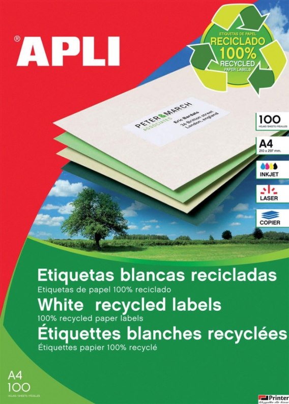 Ekologiczne etykiety samoprzylepne do drukarek atramentowych, laserowych i kserokopiarek_specjalna formuła kleju nie ulega rozpuszczeniu przy wysokich temperaturach, dzięki czemu nie wycieka i nie odkłada się na mechanizmie drukarki_rozmiar etykiety: 105x148mm_liczba etykiet na arkuszu: 4_gramatura: 143gsm (papier matowy)_białość: 140 CIE_etykiety oraz opakowanie wykonane z papieru otrzymanego w 100% z odzysku_w 100% wolne od chloru (EFC)_zawierają klej na bazie wody_darmowy program do projektowania i wydruku etykiet APLI SOFT kompatybilny również z oprogramowaniem Windows 7 dostępny na apli.com lub pbspolska.eu_100 arkuszy w j.s._kolor biały