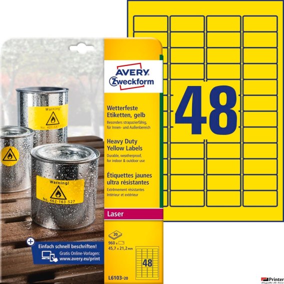 Etykiety AVERY ZWECKFORM Heavy Duty A4, 20 ark./op., 45,7 x 21,2 mm, żółte, poliestrowe |