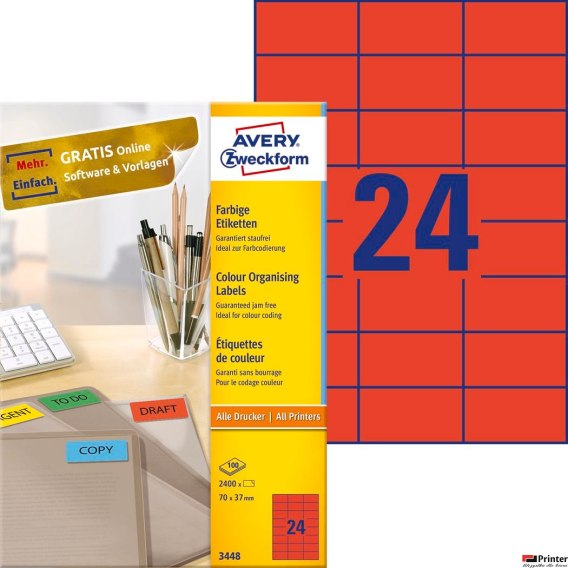 Etykiety AVERY ZWECKFORM trwałe kolorowe A4, 100 ark./op., 70 x 37 mm, czerwone |