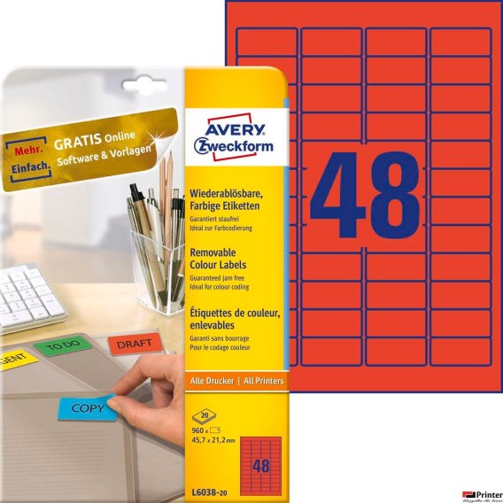Technologia druku:•INK JET: Tak•LASER: Tak•LASER COLOR: Tak•KSERO: TakCechy produktu:•Rozmiar etykiety (mm): 45,7 x 21,2•Etykiet / arkusz: 48•Arkuszy/ opakowanie: 20•Etykiet/ opakowanie: 960•Kolor: czerwone•Format: A4•Rzędów/ arkusz: 4x12•Certyfikaty: FSC