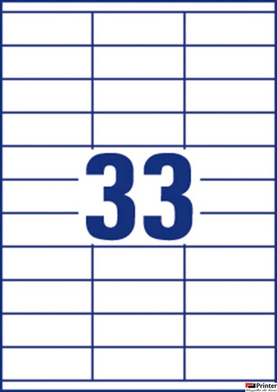 Technologia druku:•INK JET: Tak•LASER: Tak•LASER COLOR: Tak•KSERO: TakCechy produktu:•Rozmiar etykiety (mm): 70 x 25,4•Etykiet / arkusz: 33•Arkuszy/ opakowanie: 100•Etykiet/ opakowanie: 3300•Kolor: białe•Format: A4•Rzędów/ arkusz: 3x11