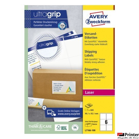 Technologia druku:•LASER: Tak•LASER COLOR: TakCechy produktu:•Rozmiar etykiety (mm): 99,1 x 93,1•Etykiet / arkusz: 6•Arkuszy/ opakowanie: 100•Etykiet/ opakowanie: 600•Kolor: białe•Format: A4•Rzędów/ arkusz: 2x3•Certyfikaty: FSC