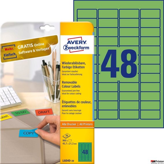 Etykiety zielone L6040-20 45,7 x 21,2 20 ark. Usuwalne, Avery Zweckform