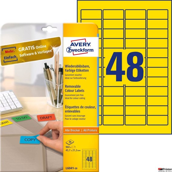 Technologia druku:•INK JET: Tak•LASER: Tak•LASER COLOR: Tak•KSERO: TakCechy produktu:•Rozmiar etykiety (mm): 45,7 x 21,2•Etykiet / arkusz: 48•Arkuszy/ opakowanie: 20•Etykiet/ opakowanie: 960•Kolor: żółte•Format: A4•Rzędów/ arkusz: 4x12•Certyfikaty: FSC