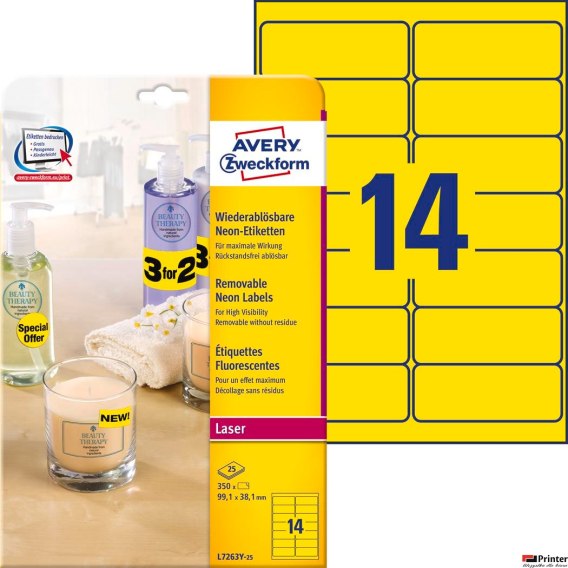 Etykiety żółte neon L7263Y-25 99,1 x 38,1 25ark. Usuwalne, Avery Zweckform SALE