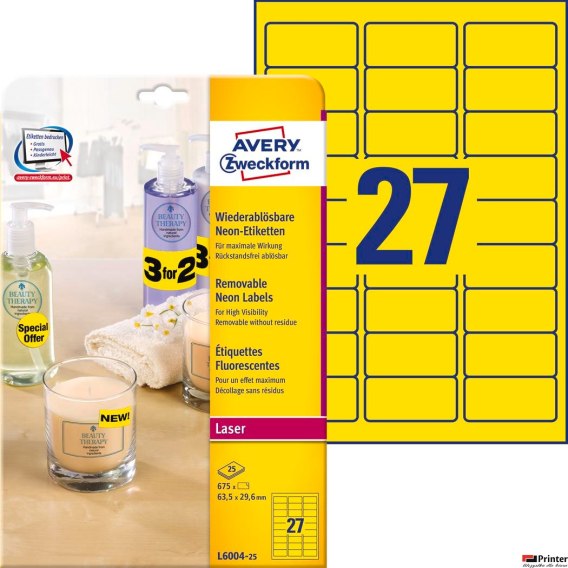Etykiety żółte neonowe L6004-25 63,5x29,6 25 ark Usuwalne, Avery Zweckform |