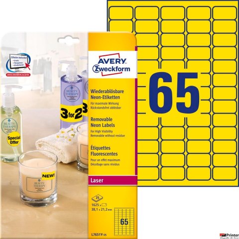 Etykiety żółte neonowe L7651Y-25 38,1x21,2 25ark Usuwalne Avery Zweckform (X)