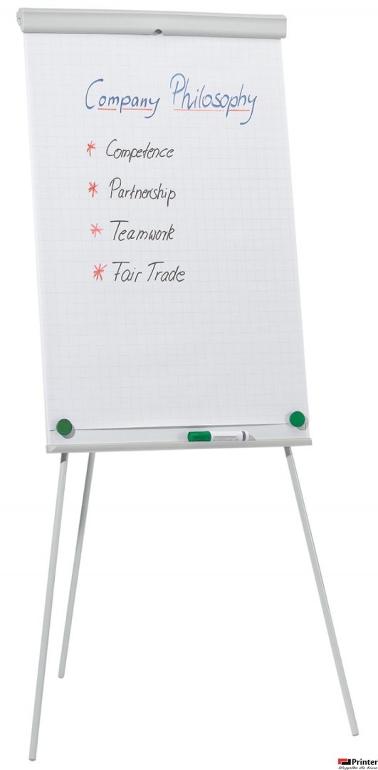 Flipchart z tablicą o powierzchni suchościeralno-magnetycznej_całość oparta na trójnogu_stelaż z regulacją wysokości max. 180cm_posiada zintegrowaną półką na artykuły piszące, co ułatwia pracę z flipchartem_posiada funkcjonalny uchwyt do mocowania papierowego bloku_rozmiar tablicy: 68x105cm_waga: 8kg