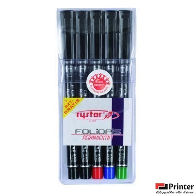 Foliopis Permanentny Rystor___ wodoodporny___ idealny do pisania na prawie wszystkich powierzchniach_gładkich (szkło, plastik, metal, porcelana, folia, płyty __CD/DVD itp.)___ zaopatrzony w szybkoschnący, nie rozmazujący się tusz,_odporny na działanie promieni słonecznych___ charakteryzuje się dużą intensywnością barw_i wyrazistością konturów___ foliopis może być pozostawiony bez zatyczki przez wiele_dni _ nie zaschnie___ korek w nasadce i obudowie określa kolor tuszu___ w każdej grubości dostępny w zestawach 5 szt. (4 kolory:_czarny, czerwony, niebieski, zielony) + dodatkowy czarny_GRATIS___ jednostka sprzedaży 1 sztuka lub 1 komplet