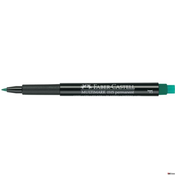 Marker uniwersalny permanentny Multimark Faber-Castell w kolorze zielonym. Z fibrową końcówką i zintegrowaną specjalną gumką. Niezawodny na prawie wszystkich powierzchniach np. metal, szkło, plastik (PP, PET, PVC itd.), płyty CD/DVD, folie do projektorów, kamień, drewno. Szybkoschnący, intensywny tusz odporny na działanie światła i wody. Rozpuszczalny w wodzie. Specjalna zintegrowana gumka sprawnie dokona korekt na prawie wszystkich gładkich powierzchniach. Szerokość linii pisania: F (0,6 mm). Dostępny 3 szerokościach linii: S, F i M, również w wersji niepermanentnej. Obudowa i zatyczka wykonane z tworzywa pochodzącego z recyklingu.