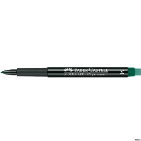 Marker uniwersalny permanentny Multimark Faber-Castell w kolorze zielonym. Z fibrową końcówką i zintegrowaną specjalną gumką. Niezawodny na prawie wszystkich powierzchniach np. metal, szkło, plastik (PP, PET, PVC itd.), płyty CD/DVD, folie do projektorów, kamień, drewno. Szybkoschnący, intensywny tusz odporny na działanie światła i wody. Rozpuszczalny w wodzie. Specjalna zintegrowana gumka sprawnie dokona korekt na prawie wszystkich gładkich powierzchniach. Szerokość linii pisania: M (1 mm). Dostępny 3 szerokościach linii: S, F i M, również w wersji niepermanentnej. Obudowa i zatyczka wykonane z tworzywa pochodzącego z recyklingu.