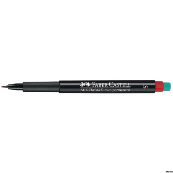 Marker uniwersalny permanentny Multimark Faber-Castell w kolorze czerwonym. Z fibrową końcówką i zintegrowaną specjalną gumką. Niezawodny na prawie wszystkich powierzchniach np. metal, szkło, plastik (PP, PET, PVC itd.), płyty CD/DVD, folie do projektorów, kamień, drewno. Szybkoschnący, intensywny tusz odporny na działanie światła i wody. Rozpuszczalny w wodzie. Specjalna zintegrowana gumka sprawnie dokona korekt na prawie wszystkich gładkich powierzchniach. Szerokość linii pisania: S (0,4 mm). Dostępny 3 szerokościach linii: S, F i M, również w wersji niepermanentnej. Obudowa i zatyczka wykonane z tworzywa pochodzącego z recyklingu.