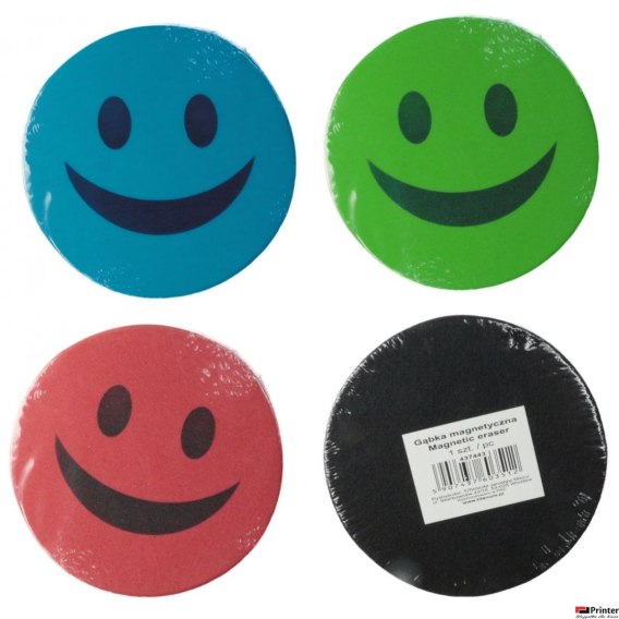 Gąbka magnetyczna przeznaczona do czyszczenia tablic suchościeralnych. Zdobiona nadrukiem uśmiechniętej buźki.