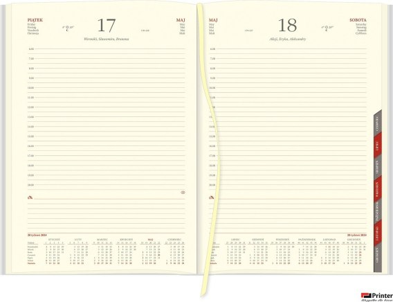 - Kalendarz w oprawie Cross z gumką w kolorze oprawy. Na gumce ażurowa blaszka z datą. Blok kalendarza szyty nićmi. Kalendarz posiada: barwne mapy przedstawiające Polskę i kraje europejskie; rozbudowaną część informacyjną; przejrzysty układ graficzny kalendarium.