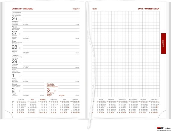 - tygodniowym z notesem na papierze białym nr A5TNB - perforacja narożna, nadrukowane registry miesięczne, biała kapitałka i tasiemka.