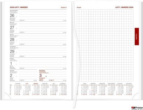 - tygodniowym z notesem na papierze białym nr A5TNB - perforacja narożna, nadrukowane registry miesięczne, biała kapitałka i tasiemka.