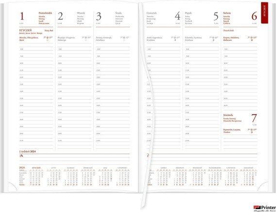 - tygodniowym na papierze białym nr B5TB - perforacja narożna, nadrukowane registry miesięczne, biała kapitałka i tasiemka.