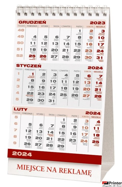- Estetyczny kalendarz stojący na biurko z kalendarium w układzie trzymiesięcznym. W dolnej części kartonowej podstawy istnieje możliwość wykonania barwnego nadruku reklamowego o wymiarach 110 x 15 mm i założenia indywidualnej okładki. Zawiera przejrzyste kalendarium z zaznaczonymi świętami i datami imienin.