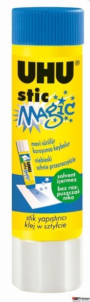 Znany klej w sztyfcie _Made in Germany_ z unikalną zakrętką, która zapobiega wysychaniu kleju. Formuła kleju składa się w 98% z naturalnych składników (w tym wody) i nie zawiera rozpuszczalników. Klei mocno, szybko i trwale, gładko przesuwa się, jest bardzo wydajne i oczywiście można go zmywać w zimnej wodzie. Dodatkowo pojemnik UHU stic wykonany jest w 50% z plastiku z odzysku. W miejscu nałożenia kleju widoczny jest niebieski kolor, po wyschnięciu staje się przezroczysty. Odpowiedni do klejenia papieru, kartonu, fotografii, styropianu, etykiet, tkanin, itp. Idealny do użytku w domu, biurze, szkole i przedszkolu.