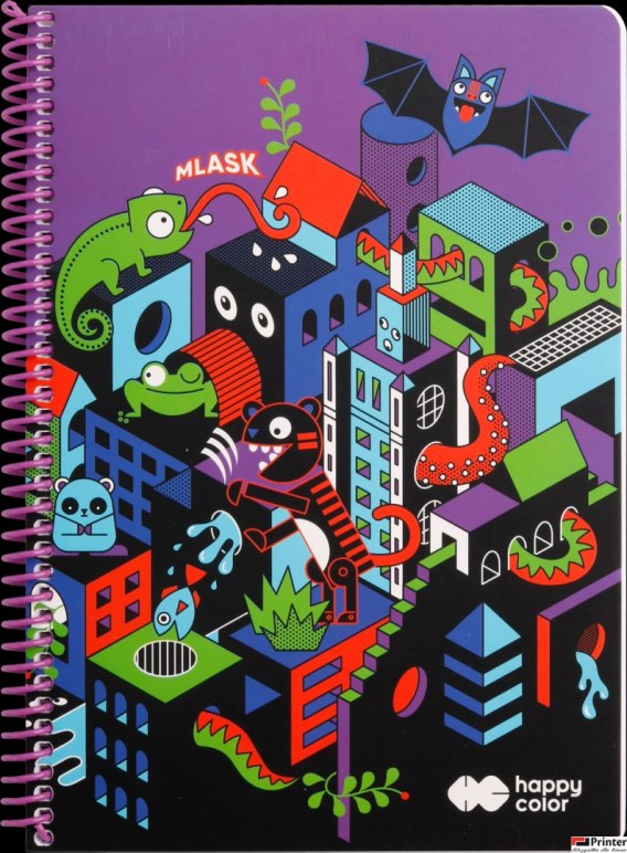 Design kolekcji Me&City, przedstawiającej surrealistyczny miejski gąszcz przygód różnych niebanalnych postaci. Sztywna okładka. Spirala dopasowana kolorystycznie do designu okładki. Biały papier 80g w szarą kratkę. 80 kartek. Format: B5 lub A4. 4 szt. w opak. zb