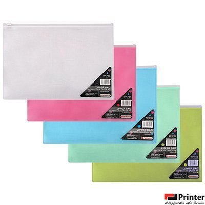 Koperta wykonana z bezbarwnego lub kolorowego polipropylenu. Zamykana na bezbarwny zamek strunowy. Wymiary: 340 x 238 mm