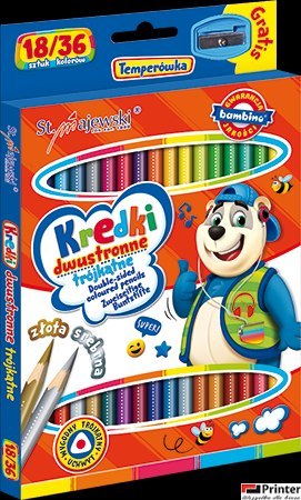 Cechy produktu:_kredki dwustronne o trójkątnym przekroju_bogata gama kolorów_kredka złota i srebrna_temperówka gratis_ilość sztuk w opakowaniu: 18_ilość kolorów: 36