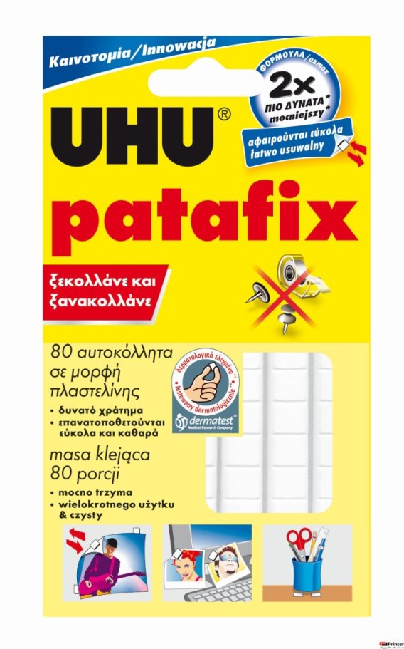 UHU Patafix - sprytna alternatywa dla pinesek, taśmy i gwoździków! UHU patafix to usuwalny, wielokrotnego użytku klej do szybkiego i czystego mocowania małych przedmiotów, takich jak zdjęcia, pocztówki, rysunki, plakaty, itp. na różnych powierzchniach, takich jak ściany, drzwi lub meble. 1000 zastosowań w domu, w szkole lub w biurze! Testowany dermatologicznie - UHU Patafix uzyskał ocenę _BARDZO DOBRY_ w testach dermatologicznych niezależnego instytutu dermatest_. Do czasowego, jak i trwałego mocowania małych przedmiotów na drewnie, cemencie, szkle, metalu, plastiku i porcelanie. Nadaje się do mocowania plakatów, dekoracji, małych urządzeń elektronicznych, kabli i wielu innych. Nieodpowiednie do delikatne powierzchnie i materiały. Nie używać na ostatnio malowanych powierzchniach i tapetach. Najpierw wypróbowaćna małej powierzchni.