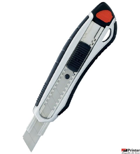 _ solidny nóż aluminowy z rączką TPR (z gumy termoplastycznej) __ metalowa prowadnica __ karbowane brzegi zapewniają lepszy chwyt __ otwór do zawieszania __ wysuwane, łamane ostrze __ samoczynna blokada ostrza __ wymiana ostrza po naciśnięciu czerwonego guziczka w uchwycie __ do cięższych prac __ szerokość ostrza: 18 mm__ łamanie ostrza: 7 części