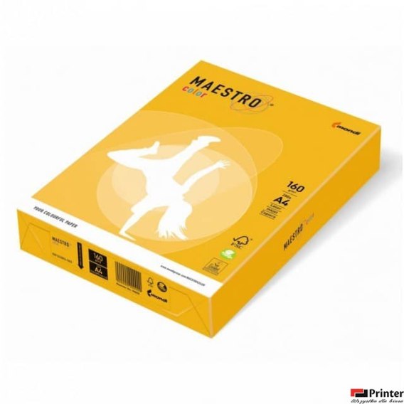 Najwyższej jakości papier biurowy barwiony w masie celulozowej. Polecany do wydruków w drukarkach laserowych i atramentowych, a także w wysoko-nakładowych urządzeniach kopiujących. Zachowuje odporność barwy na starzenie. Dostępny w formatach A4, A3 w gramaturze 80 g/m2 oraz w A4 w gramaturze 160 g/m2 . W gramaturze 80 g/m2 pakowany jest po 500 arkuszy w ryzie, w gramaturze 160 g/m2 po 250 arkuszy w opakowaniu. Produkcja papierów MAESTRO jest zgodna z normami ochrony środowiska._Szeroka paleta 29 kolorów, dostępna w 4 grupach kolorystycznych: pastelowej, intensywnej, Trend i Neonowy odcień._Dostępne kolory: wanilia-BE66, kremowy -CR20, żółty-YE23, łososiowy- SA24, flamingo-OPI74, różowy-PI25, jasna zieleń-GN27, zielony-MG28, błękit arktyczny-OBL70, jasny niebieski-BL29, niebieski-MB30, cytrynowy -ZG34, złoty-GO22, złota patyna-AG10, lawenda-LA12, szary-GR21, kanarkowy-CY39, żółć siarkowa-IG50, żółty słoneczny-SY40, czerwień ceglasta-ZR0(tylko 80gsm), pomarańczowy-0R43, czerwień koralowa-CO44, zieleń limonki-LG