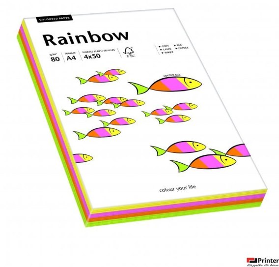 Papier kolorowy Rainbow mix pastelowy_Wysokiej jakości, kolorowy papier, bezdrzewny, barwiony w masie, o szerokim wachlarzu kolorystycznym. Zalecany do wydruków faksowych, korespondencji oraz zaproszeń i ulotek. Pakowany w eleganckie przezroczyste opakowanie. A4 80 g pakowane po 5 kolorów x 20 arkuszy.- jednostka sprzedaży 1 ryza