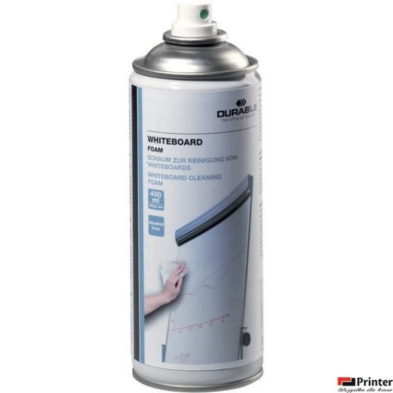 Pianka do czyszczenia tablic suchościeralnych. Formuła pianki zapobiega ściekaniu środka czyszczącego po tablicy. Usuwa brud, tłuszcz i plamy po markerach suchościeralnych. Stosowany ze ściereczkami Durable 5734, 5786. Środek przyjazny dla środowiska. Pojemność 400 ml.