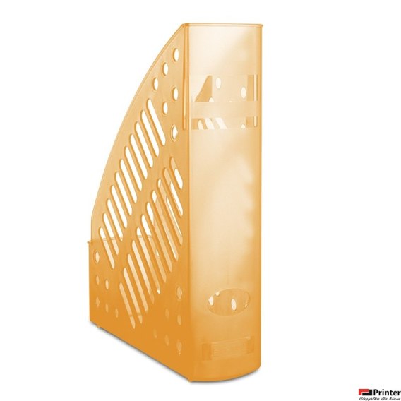 Pojemnik na dokumenty, ażurowy, wykonany z twardego, odpornego na pęknięcia polistyrenu_posiada Zielony Punkt (Der Gr_ne Punkt) - udział w systemie recyklingu i odzysku odpadów wynikający z przepisów prawa polskiego i UE_szerokość grzbietu: 70mm_pojemność: do 700 kartek o gramaturze 80gsm_sztywna konstrukcja o zwiększonej stabilności_ścięte boki ułatwiają wkładanie i wyjmowanie dokumentów_tworzywo przeznaczone do recyklingu_wymiary: 70x315x240mm_kolor transparentny pomarańczowy