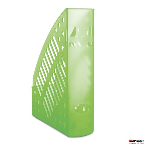 Pojemnik na dokumenty, ażurowy, wykonany z twardego, odpornego na pęknięcia polistyrenu_posiada Zielony Punkt (Der Gr_ne Punkt) - udział w systemie recyklingu i odzysku odpadów wynikający z przepisów prawa polskiego i UE_szerokość grzbietu: 70mm_pojemność: do 700 kartek o gramaturze 80gsm_sztywna konstrukcja o zwiększonej stabilności_ścięte boki ułatwiają wkładanie i wyjmowanie dokumentów_tworzywo przeznaczone do recyklingu_wymiary: 70x315x240mm_kolor transparentny zielony