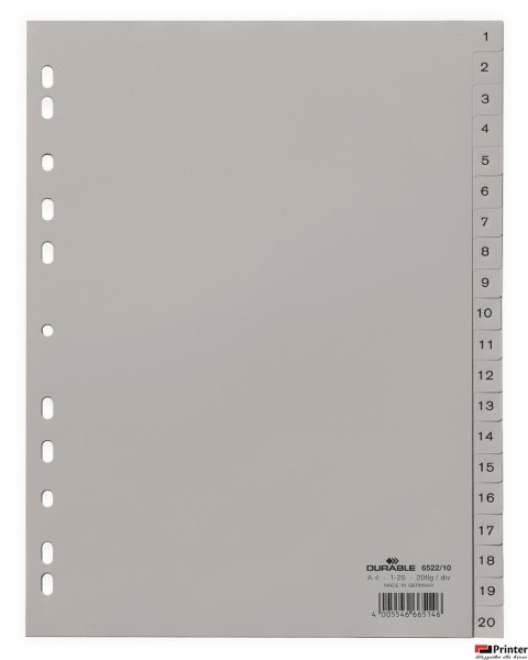• Przekładki PP A4 szare, nadr. indeks, 1-20, 2 0 części Szary 652210 DURABLE