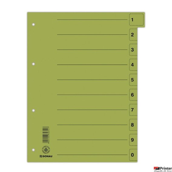 Wykonane z grubego kartonu o gramaturze 250gsm uzyskanego na drodze recyklingu_posiada Zielony Punkt (Der Gr_ne Punkt) - udział w systemie recyklingu i odzysku odpadów wynikający z przepisów prawa polskiego i UE_posiada certyfikat Blauer Engel_indeksy z mikroperforacją umożliwiającą łatwe i szybkie dostosowanie przekładki do indywidualnych potrzeb bez użycia nożyczek_ilość przekładek: 10_pierwsza karta opisowa z numerami_dziurkowanie: 4_format: A4_rozmiar przekładki: 235x300mm_kolor zielony