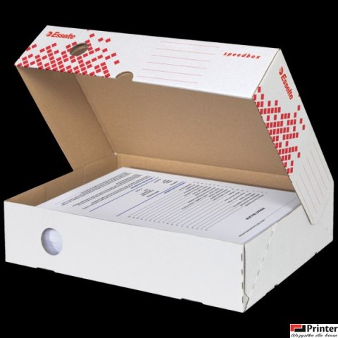 Pudło otwierane od szerszej strony Esselte Speedbox _Pudła Speedbox zapewniają oszczędność czasu i wysiłku. Gotowe do zarchiwizowania dokumentów w kilka sekund. Łatwe i intuicyjne do złożenia. Nie ma potrzeby używania instrukcji.__ Automatycznie składane dno, zapewnia oszczędność czasu__ Dzięki otwarciu z szerszej strony wygodniej jest wkładać i wyjmować dokumenty __ Mają podwójne wieko zabezpieczające przed przypadkowym otwarciem oraz wzmocniony otwór na palec__ Do przechowywania dokumentów w formacie A4, w koszulkach czy folderach__ Idealny rozmiar do systemów regałowych, pudło może być umieszczane w poziomie lub w pionie__ Wykonane z kartonu w 100% pochodzącego z recyklingu i w 100% nadającego się do ponownego przetworzenia; posiadają certyfikat FSC