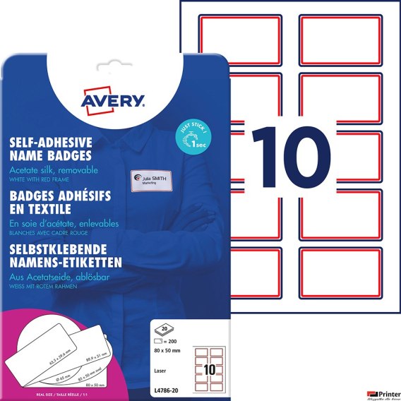 Samoprzylepne identyfikatory 80 _ 50 mm, 20 ark., czerwona ramka, sztuczny jedwab, L4786_20, Avery Zweckform