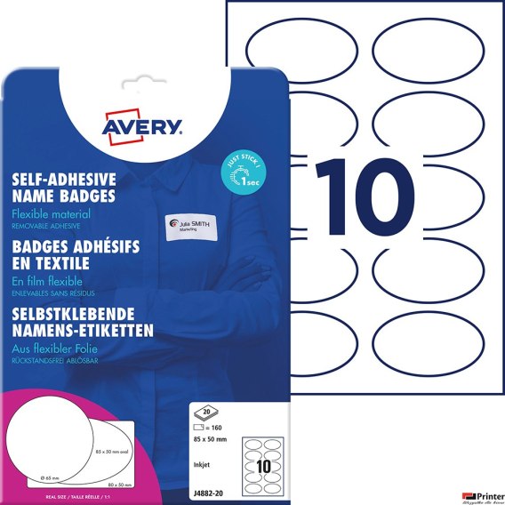 Samoprzylepne identyfikatory A4, 20 ark., owalne 85 _ 50 mm, białe, folia, usuwalne, J4882_20, Avery Zweckform