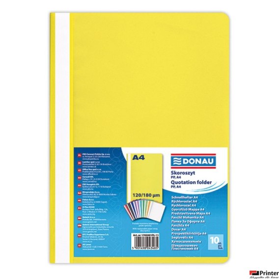 Wykonany z ekologicznego polipropylenu_posiada Zielony Punkt (Der Gr_ne Punkt) - udział w systemie recyklingu i odzysku odpadów wynikający z przepisów prawa polskiego i UE_strona przednia transparentna - grubość PP: 120_m_strona tylna kolorowa - grubość: 180_m_mieści ok. 200 kartek (2cm)_niewpinany_wymienny, dwustronnie zapisywalny pasek brzegowy_format: A4_rozmiar: 222x307mm_kolor żółty