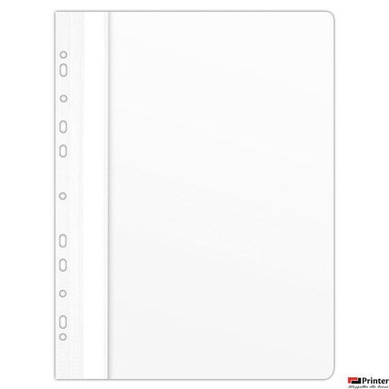 Wykonany z PVC, twardy_strona przednia transparentna - grubość: 150_m; tylna kolorowa: 160_m_mieści ok. 200 kartek_posiada 11 dziurek do wpięcia do segregatora_wymienny, dwustronnie zapisywalny pasek brzegowy_____wąs o długości 16,5cm_format: A4_rozmiar: 235x310mm_kolor biały