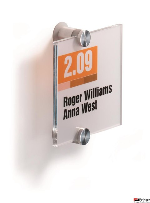 Elegancka ponadczasowa tabliczka na drzwi z wysokiej jakości szkła akrylowego w 7 różnych rozmiarach. Przezroczyste płytki akrylowe, spolerowane na obrzeżach oraz półprzezroczysta folia nadają tabliczce wyjątkowy wygląd. Dwie płytki akrylowe wraz z folią znajdującą się pomiędzy nimi, są przymocowane do ściany przy pomocy dwóch ozdobnych śrub mocujących. Prosty montaż przy pomocy intrukcji. Foliowe etykiety w formacie A4 dzięki perforacji łatwo dzielą się na mniejsze. Nadruk możliwy przy pomocy drukarki laserowej zarówno w kolorze czarnym jak i w innych kolorach. Prosta wymiana etykiet. Do tabliczki dołączone są dwie folie do zadrukowania. Wzory formatów dostępne na stronie www.durable.pl