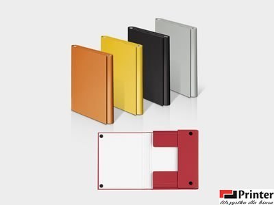 _wykonana z twardej tektury o grubości 2 mm__kolorowa oklejka, pokryta folią polipropylenową__wyklejka papierowa__do formatu A4 lub A5__szerokość grzbietu do 40mm__zamykana na 2 rzepy